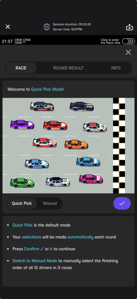 If you want to see what is going on behind the scenes, try this: “Click to Enter Race View” button in the upper right corner of the screen. This will reveal the actual racing results that determined the outcome – the specific date, the race, which selections were correct, and how the historical results translated into your win or loss.