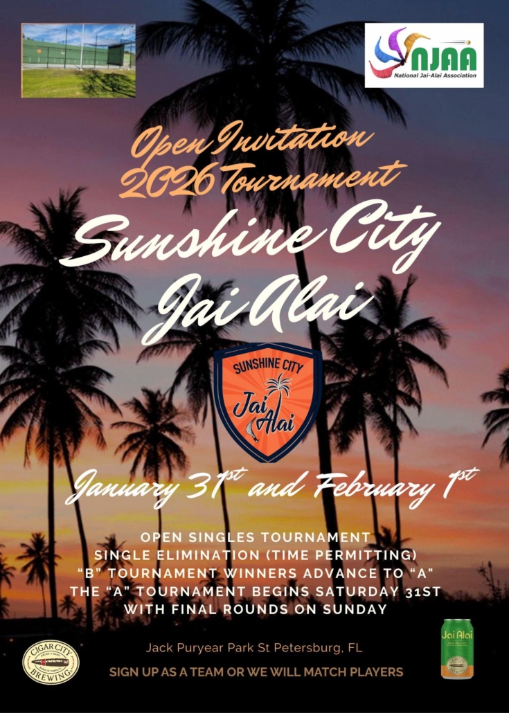 Scott King and his Sunshine City group are hosting their 3rd annual jai-alai tournament January 31st and February 1st. That may sound like it’s a long way away, but it’s not. Now is this time to make sure you plan on attending or playing in it. The event is clearly the best event held yearly with a lot of great players attending from all over – Connecticut, N Miami, Tampa Bay/Orlando and even Spain/Magic City players. Scott knows just about everyone in jai-alai and has the connections to assemble a great group. He played pro for nearly15 years (mainly at Tampa Jai-alai) and has been an active player at Puryear for the past 13 years or so.