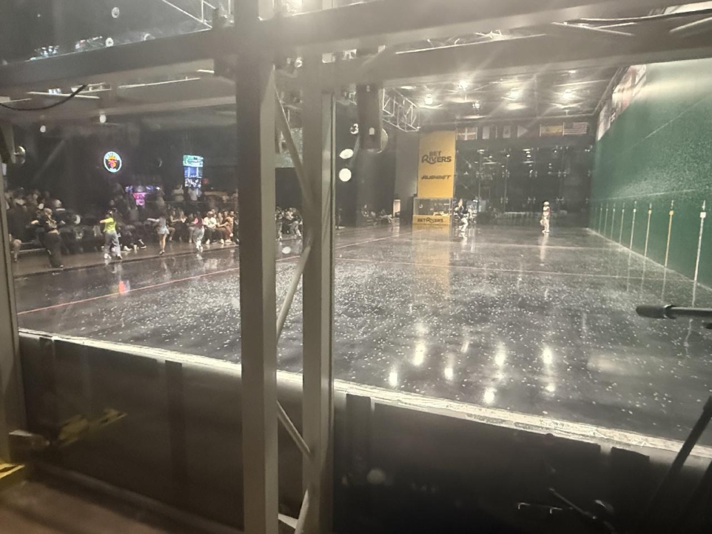The second half featured the Devils defeating the Fireballs in “overtime” with Benetrix and Roque defeating Joseph and Ikeda 6-2 in a one game playoff. The teams were deadlocked at 3 games apiece and were decided by Division 5 players in a winner take all game to 6 points. An enthusiastic crowd of about 70 were in attendance including team owners. When opened to the public, it’s an entirely different atmosphere. The DJ cranks out songs on a phenomenal sound system right up till the serve is made and then resuming right after the point ends. Young girls and couple of boys did cheerleader-like dances between games to entertain the crowd. A huge difference then the sterile atmosphere from all other performances when no one from the general public is welcome to watch. Unlike Dania Jai alai, you can hear Stu and Andrew announce the games. Nice color programs were available to all and loads of gift baskets were given away to dancers in the crowd. Even former Dania pro and current Puryear Park regular Bob “Garby” got one!