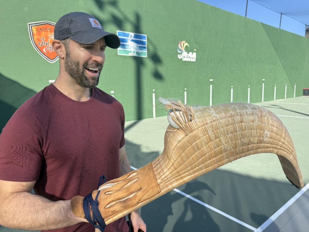 Making a return was former pro Goitia. Author of the popular jai-alai book “The Other Side of the Screen”, Goitia was there along with his son Patrick. Patrick had showed up a couple days before the Scott King event using one of the cesta’s his dad had used in the 80s. Patrick was able to secure a win in his first game with Rastock and played quite well for someone making their first appearance on the St. Pete cancha. But a little later in the performance, a pelota went right thru his cesta – likely from the aging basket sitting in a closet for decades.