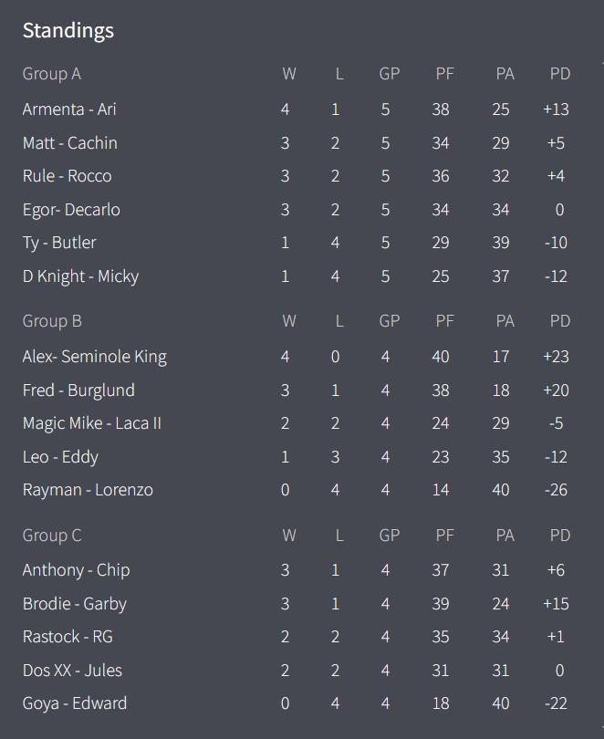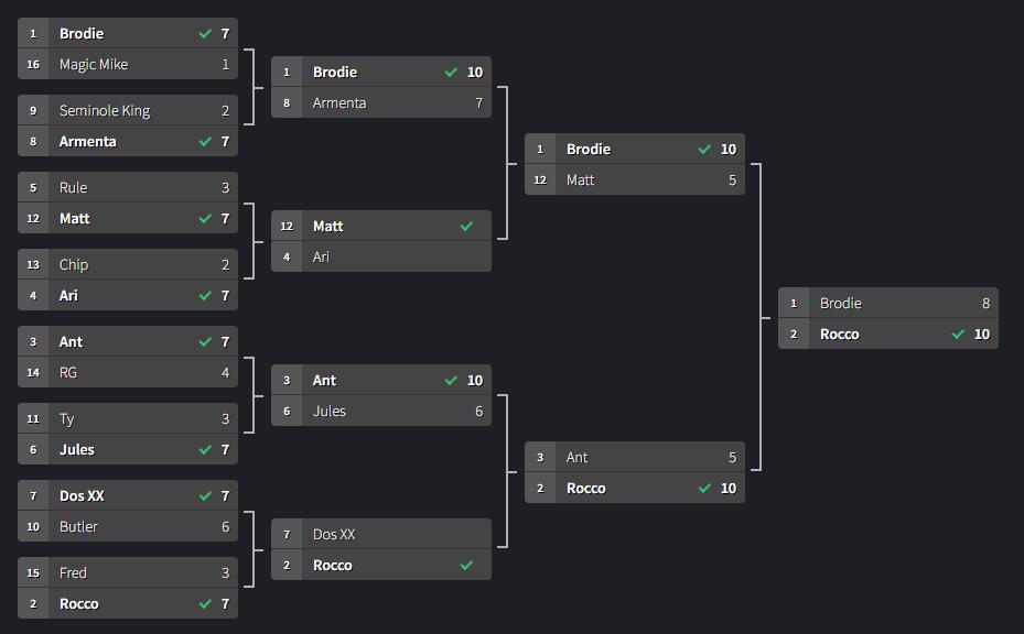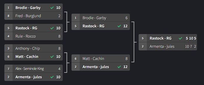 The doubles tournament turned out to be a St. Pete vs. Miami battle and was won by Rastock and RG3. They beat Armenta and Super Jules in overtime. The Miami boys won the first game, 10-5, the St. Pete guys won the second game 10-7, forcing a 5-point winner take all game 3. Rastock and RG3 took that game 5-2.